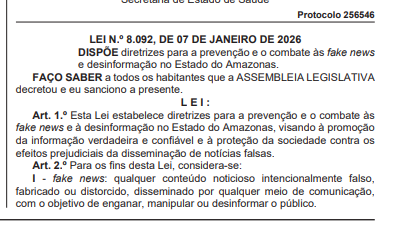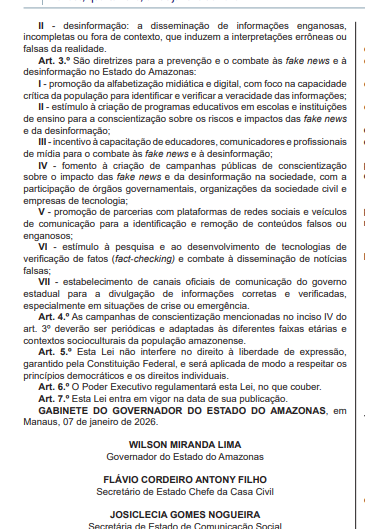 O governador do Amazonas, Wilson Lima (UB), sancionou a Lei nº 8.092, de 7 de janeiro de 2026, que estabelece diretrizes para a prevenção e o combate às fake news e à desinformação em todo o Estado. A norma foi publicada no Diário Oficial do Estado (DOE) e entrou em vigor na data da publicação.