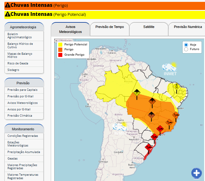 Em Minas, o Inmet emitiu quatro avisos: um de chuva intensa (nível amarelo) e três de risco moderado (nível laranja), sendo dois de tempestade com granizo e um de chuva forte.