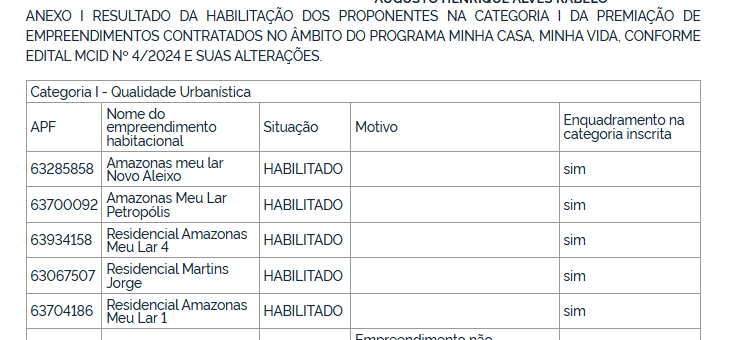 Entre os projetos habilitados na Categoria I, que avalia a qualidade urbanística, estão Amazonas Meu Lar Novo Aleixo, Amazonas Meu Lar Petrópolis, Residencial Amazonas Meu Lar 4, Residencial Martins Jorge e Residencial Amazonas Meu Lar 1.Já o Residencial Amazonas Meu Lar 02 Tarumã foi inabilitado por não envio de documentação.