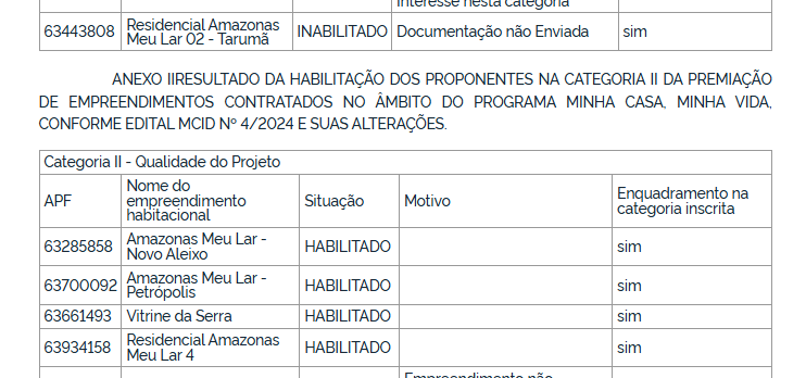 Na Categoria II, que analisa a qualidade do projeto arquitetônico e técnico, também aparecem como habilitados Amazonas Meu Lar Novo Aleixo, Amazonas Meu Lar Petrópolis, Vitrine da Serra e Residencial Amazonas Meu Lar 4.