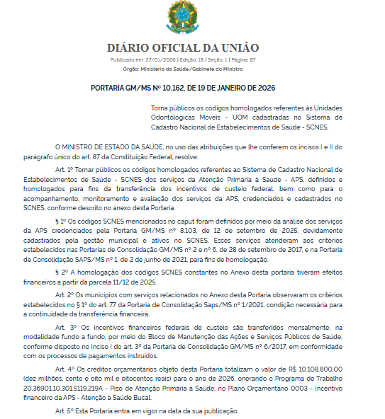 A portaria torna públicos os códigos das Unidades Odontológicas Móveis registrados no Sistema de Cadastro Nacional de Estabelecimentos de Saúde, etapa necessária para o acompanhamento, monitoramento e avaliação dos serviços ofertados pelo Sistema Único de Saúde. A homologação tem efeitos financeiros a partir da parcela 11 de 12 de 2025.