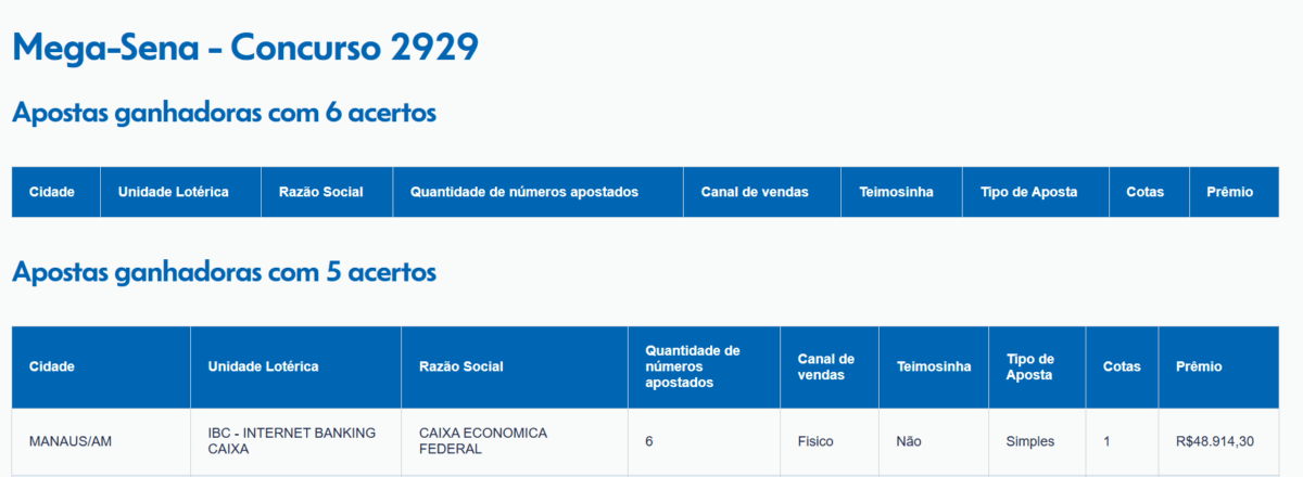 Uma aposta de Manaus realizada pela Internet Banking Caixa, a plataforma on-line da Caixa Econômica Federal, acertou cinco números do Concurso 2929 da Mega Sena e vai levar para casa o prêmio de R$ 48.914,30. O sorteio aconteceu, neste sábado (18/10), no Espaço da Sorte, em São Paulo.