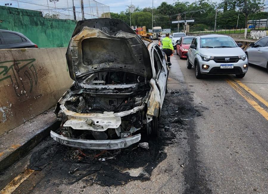 Um carro pegou fogo na manhã desta sexta-feira (23/01) e provocou lentidão no trânsito na saída do viaduto da avenida Darcy Vargas, no bairro Chapada, sentido Bola das Letras, na zona Centro-Sul de Manaus.