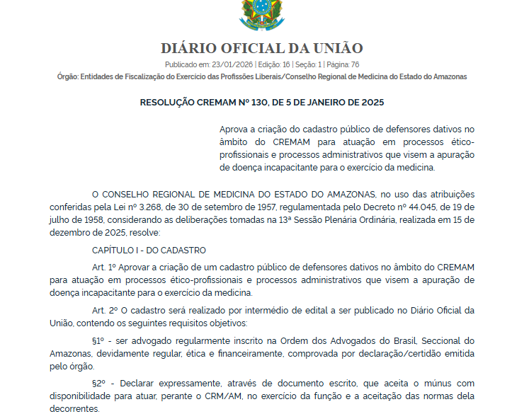 O Conselho Regional de Medicina do Estado do Amazonas (Cremam) aprovou a criação de um cadastro público de defensores dativos para atuação em processos ético-profissionais e em procedimentos administrativos voltados à apuração de doença incapacitante para o exercício da medicina. A medida consta na Resolução Cremam nº 130, de 5 de janeiro de 2025, publicada no Diário Oficial da União (DOU) desta sexta-feira (23/1).