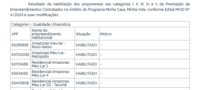 Na Categoria I, que avalia a qualidade urbanística, diversos projetos do estado foram considerados habilitados, entre eles Amazonas Meu Lar Novo Aleixo, Amazonas Meu Lar Petrópolis, Residencial Amazonas Meu Lar 1, Residencial Amazonas Meu Lar 4 e o Residencial Amazonas Meu Lar 02 no bairro Tarumã. Outros empreendimentos localizados na capital amazonense também avançaram nesta fase, como Mais Moradia, Mais Moradia Sonhos e o Residencial Vivaldo Herbst.