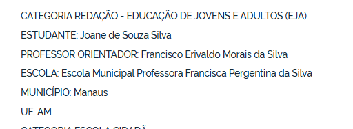 Na categoria Redação, a capital amazonense voltou a aparecer com Joane de Souza Silva, da Educação de Jovens e Adultos. Ela é estudante da Escola Municipal Professora Francisca Pergentina da Silva, também em Manaus, e venceu na modalidade voltada à EJA, com orientação do professor Francisco Erivaldo Morais da Silva.