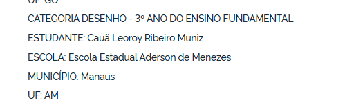 Entre os vencedores na categoria Desenho, o Amazonas foi representado por Cauã Leoroy Ribeiro Muniz, aluno do 3º ano do Ensino Fundamental da Escola Estadual Aderson de Menezes, em Manaus. O estudante foi premiado por um trabalho que se destacou entre produções de todo o país.