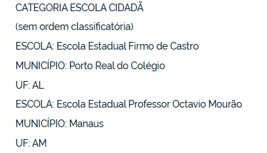 O Amazonas também marcou presença na categoria Escola Cidadã, que reconhece instituições de ensino com ações de mobilização e engajamento comunitário. A Escola Estadual Professor Octavio Mourão, localizada em Manaus, está entre as 17 escolas selecionadas pela comissão julgadora em todo o Brasil.