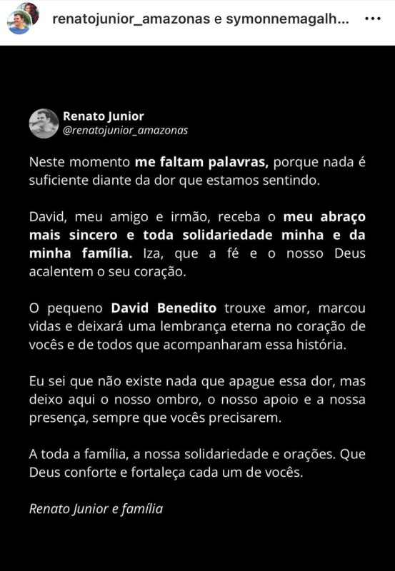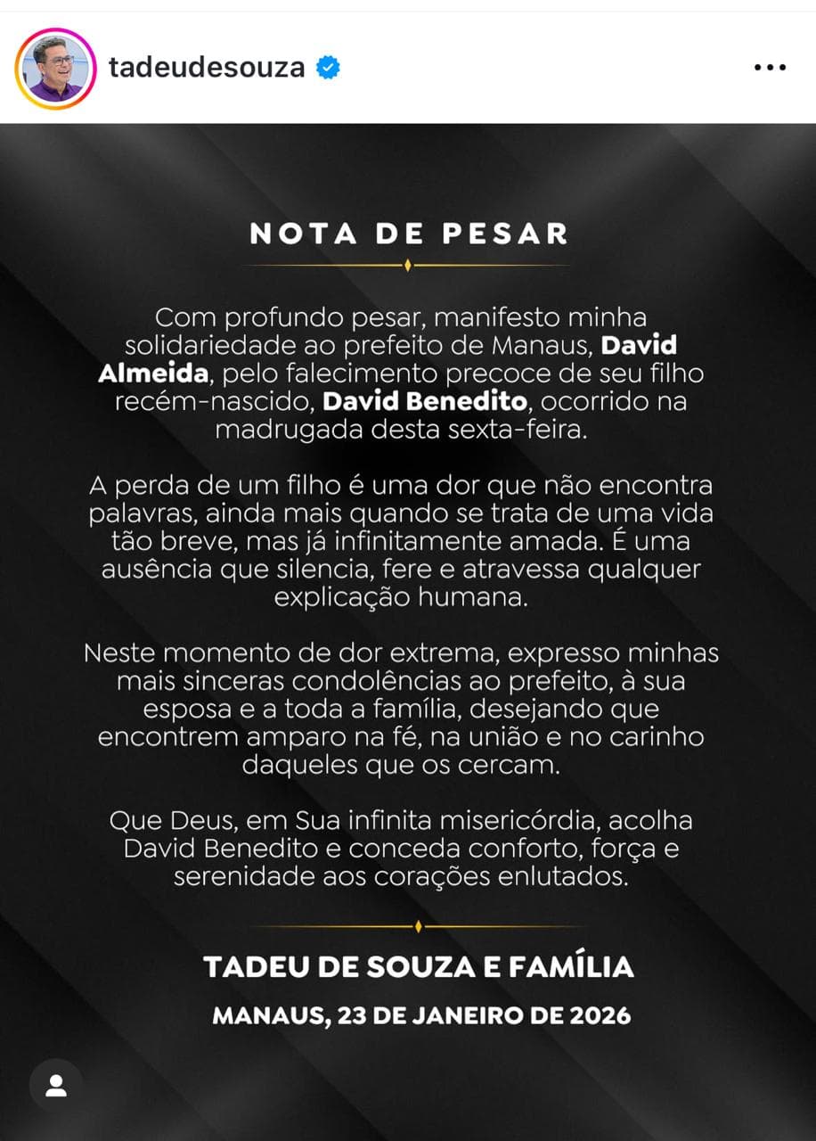 “É com o mais profundo pesar e consternação que a Prefeitura de Manaus, por meio da Secretaria Municipal de Comunicação (Semcom), comunica o falecimento de David Benedito, filho do prefeito David Almeida e da primeira-dama Izabelle Almeida, ocorrido nesta sexta-feira, 23/1.
