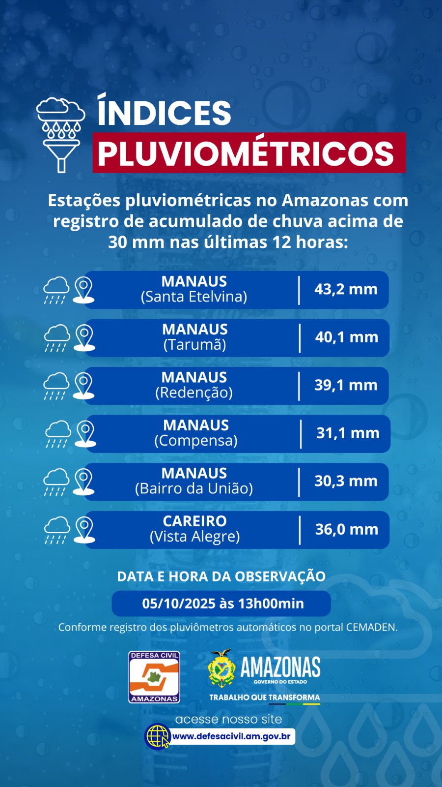 De acordo com dados da Defesa Civil do Amazonas, divulgados neste domingo (5), várias áreas de Manaus registraram forte volume de chuva nas últimas 12 horas. O maior índice pluviométrico foi observado no bairro Santa Etelvina, com 43,2 milímetros. Em seguida, aparecem o Tarumã (40,1 mm), Redenção (39,1 mm), Compensa (31,1 mm) e Bairro da União (30,3 mm). No interior, o município de Careiro, na comunidade Vista Alegre, também teve acumulado expressivo, com 36 milímetros. As informações são baseadas em registros dos pluviômetros automáticos do Centro Nacional de Monitoramento e Alertas de Desastres Naturais (Cemaden).