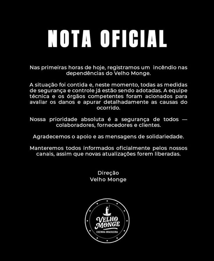 O Corpo de Bombeiros foi acionado e ainda apura as causas do fogo e faz o trabalho de rescaldo. A corporação deve apurar detalhadamente o sinistro. A equipe do Velho Monge publicou uma nota em seu perfil do Instagram, informando que a situação já foi contida e que todas as medidas de segurança já estão sendo adotadas. A direção também se comprometeu em liberar novas informações assim que houver atualizações. A nota não fala nada sobre possíveis causas do fogo, nem de feridos.