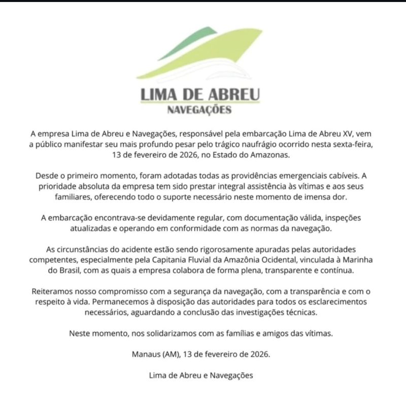 Em uma nota publicada, na noite desta sexta-feira (13/02), a Lima de Abreu Navegações lamentou a tragédia e informou que foram tomadas todas as providências emergenciais cabíveis. Além disso, a empresa destacou que a prioridade no momento é prestar integral assistência às vítimas e aos familiares.
