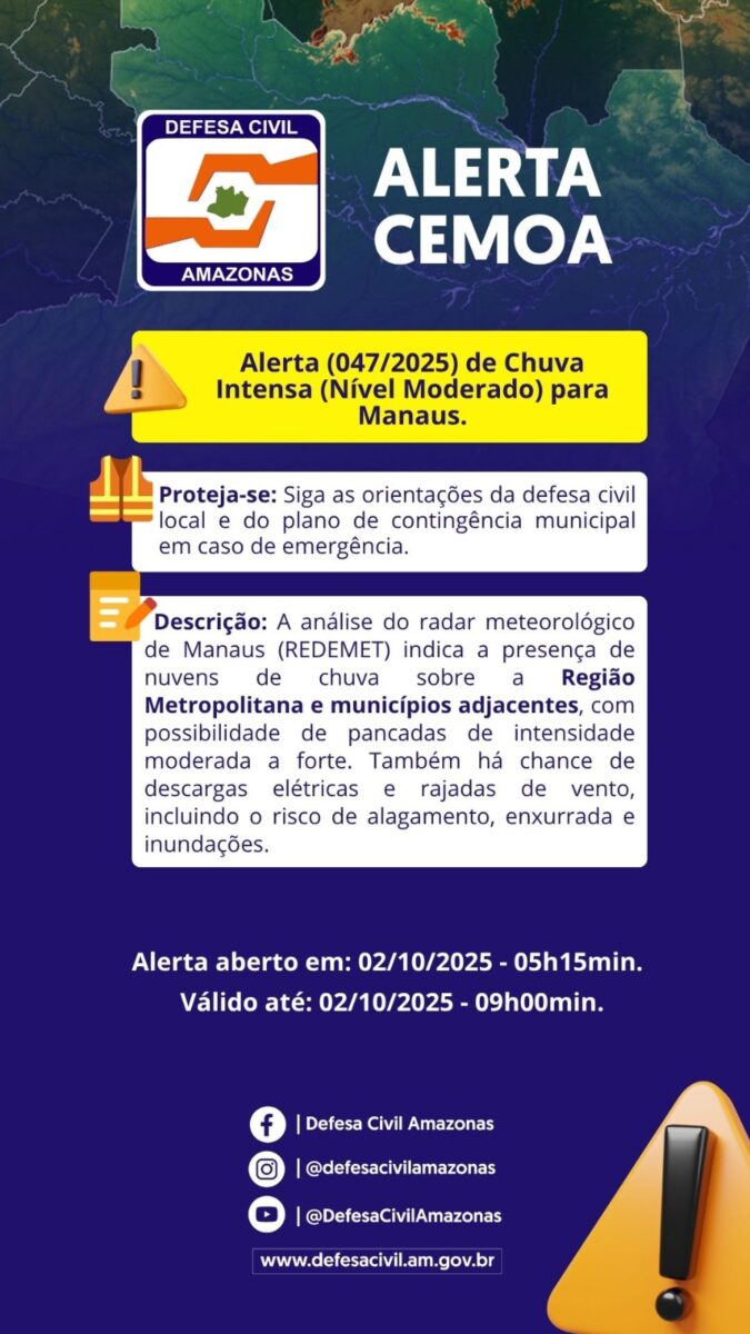 A Defesa Civil do Amazonas emitiu um alerta para chuva intensa para Manaus e também na Região Metropolitana. Ainda de acordo com o órgão, há possibilidade de pancadas de intensidade moderada a forte.