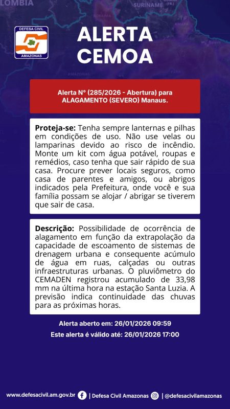Manaus está sob alerta severo para alagamentos nesta segunda-feira (26/01), conforme aviso emitido pela Defesa Civil do Amazonas, por meio do Centro de Monitoramento e Alerta (Cemoa). O comunicado indica risco elevado de ocorrências provocadas pelo grande volume de chuvas na capital.