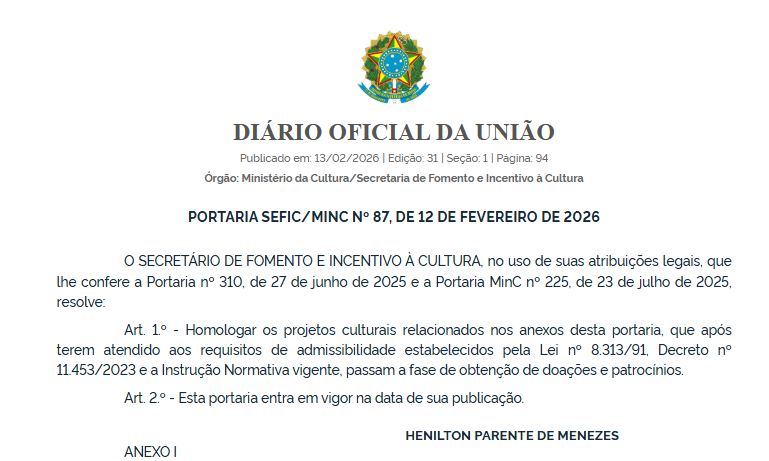 O Ministério da Cultura homologou três projetos culturais do Amazonas que, juntos, somam mais de R$ 1,7 milhão em recursos autorizados para captação por meio da Lei Rouanet. A decisão consta na Portaria nº 87/2026 da Secretaria de Fomento e Incentivo à Cultura, publicada no Diário Oficial da União (DOU) desta quinta-feira (13/2).