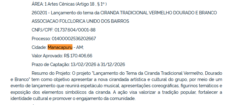 Em Manacapuru, a Associação Folclórica Unido dos Bairros teve aprovado o projeto “Lançamento do Tema da Ciranda Tradicional Vermelho, Dourado e Branco”, com valor autorizado de R$ 170.406,66. A iniciativa prevê um evento cultural com espetáculo musical, apresentações coreográficas, figurinos temáticos e exposição de elementos simbólicos da ciranda, fortalecendo a tradição popular e a identidade cultural do município. O prazo para captação segue até 31 de dezembro de 2026.