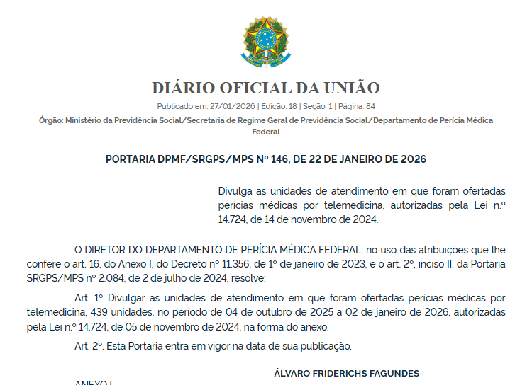 A portaria entra em vigor na data de sua publicação e reforça o uso da telemedicina como ferramenta permanente no atendimento previdenciário, ampliando a cobertura e a eficiência das perícias médicas no país.
