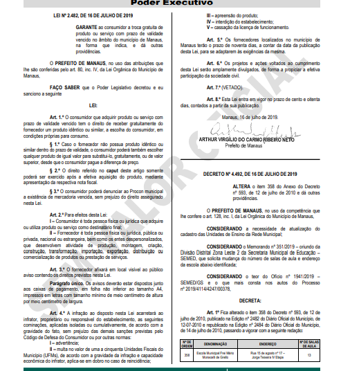 O consumidor de Manaus que comprar um produto com prazo de validade vencido tem direito à troca gratuita por outro item idêntico ou similar, em perfeitas condições de consumo. A garantia está prevista na Lei Municipal nº 2.482/2019, que estabelece regras para fornecedores na capital amazonense.