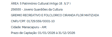Entre os projetos contemplados está “Jovens Guardiões da Cultura”, desenvolvido pelo Grêmio Recreativo e Folclórico Ciranda Flor Matizada, com sede em Manacapuru, na Região Metropolitana de Manaus. A iniciativa atua na área de patrimônio cultural e poderá captar recursos por meio de doações e patrocínios incentivados pela Lei Rouanet até 31 de dezembro de 2026.
