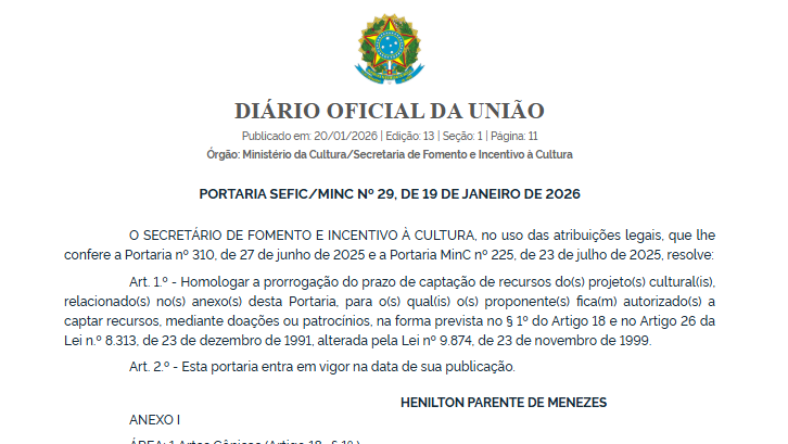 Segundo o Ministério da Cultura, a prorrogação do prazo busca ampliar as possibilidades de financiamento e garantir a execução das propostas aprovadas, fortalecendo o setor cultural e incentivando a participação da iniciativa privada no fomento às atividades artísticas e culturais.