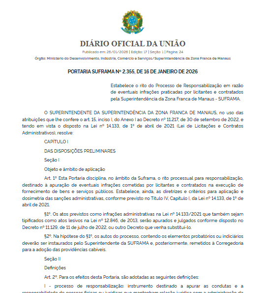 A Superintendência da Zona Franca de Manaus (SUFRAMA) publicou no Diário Oficial da União desta segunda-feira (26/1) a Portaria nº 2.355/2026, que estabelece o rito do Processo de Responsabilização para apuração de eventuais infrações cometidas por licitantes e contratados da autarquia. A norma regulamenta procedimentos previstos na Lei nº 14.133/2021, a nova Lei de Licitações e Contratos Administrativos.