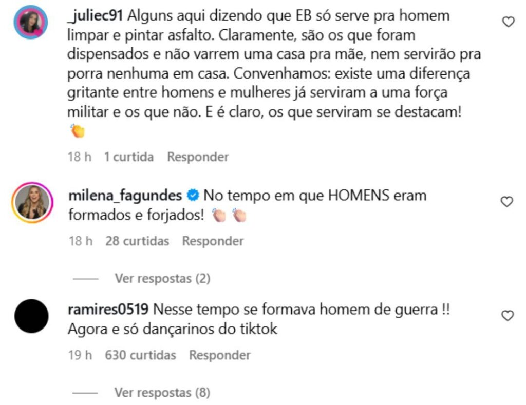 A ex-BBB Milena Fagundes também comentou as imagens “No tempo em que HOMENS eram formados e forjados!”, declarou. Outro internauta comentou “Nesse tempo se formava homem de guerra !! Agora e só dançarinos do tiktok”.