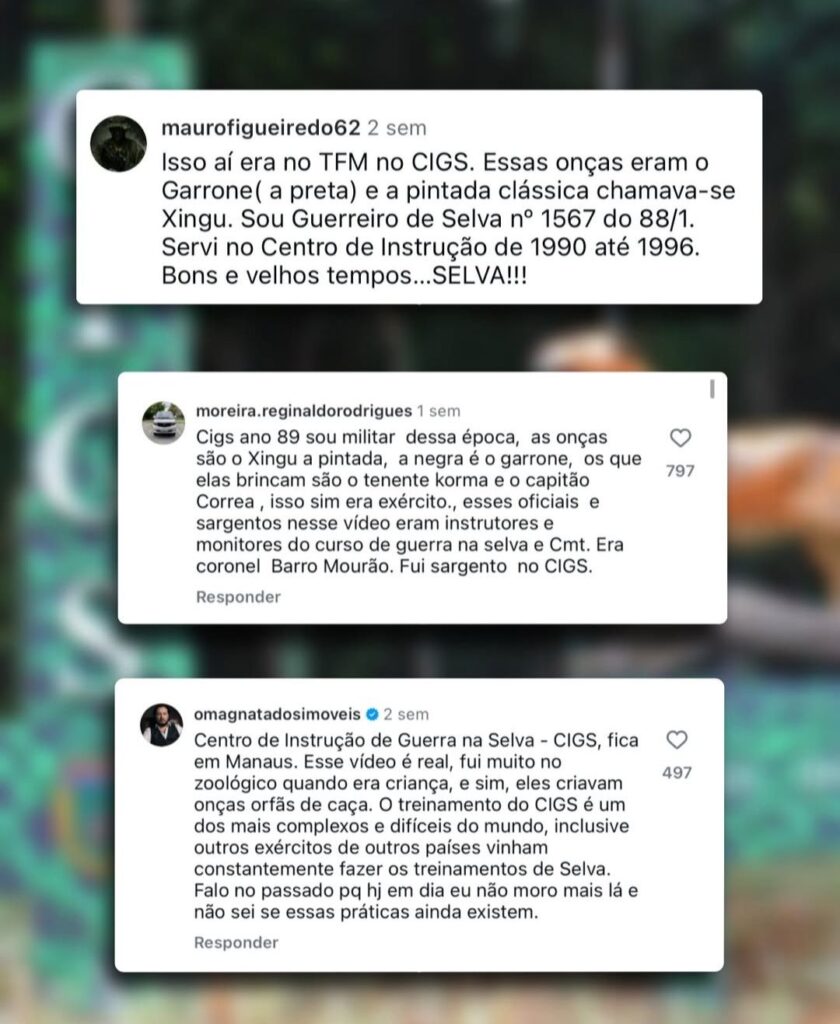 Nos comentários, antigos servidores do CIGS deram detalhes sobre o treinamento. Um deles, que atuou entre 1990 e 1996 e se identifica como “Guerreiro de Selva nº 1567”, disse que o exercício acontecia no local e até identificou as onças: a melânica se chamava Garrone, e a pintada, Xingu.