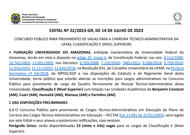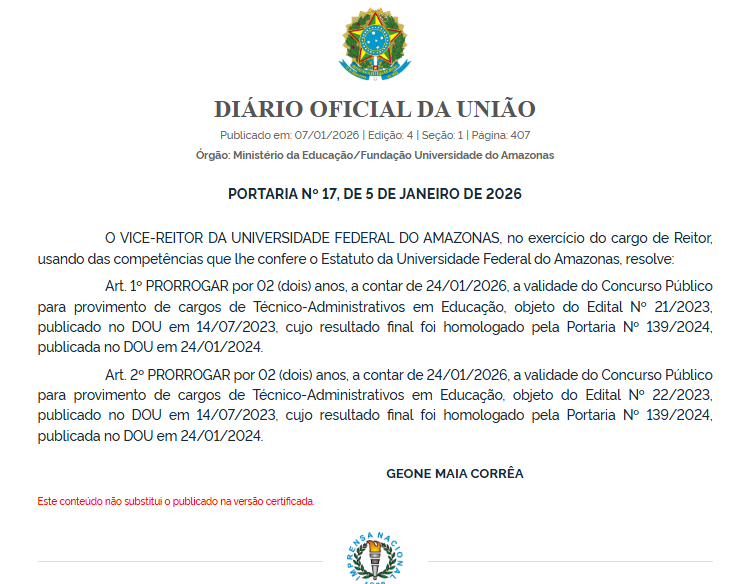 A Universidade Federal do Amazonas (UFAM) prorrogou por mais dois anos a validade de dois concursos públicos para cargos de Técnico-Administrativos em Educação. A decisão consta na Portaria nº 17, publicada no Diário Oficial da União (DOU) nesta quarta-feira (7/1), e passa a valer a partir de 24 de janeiro de 2026.