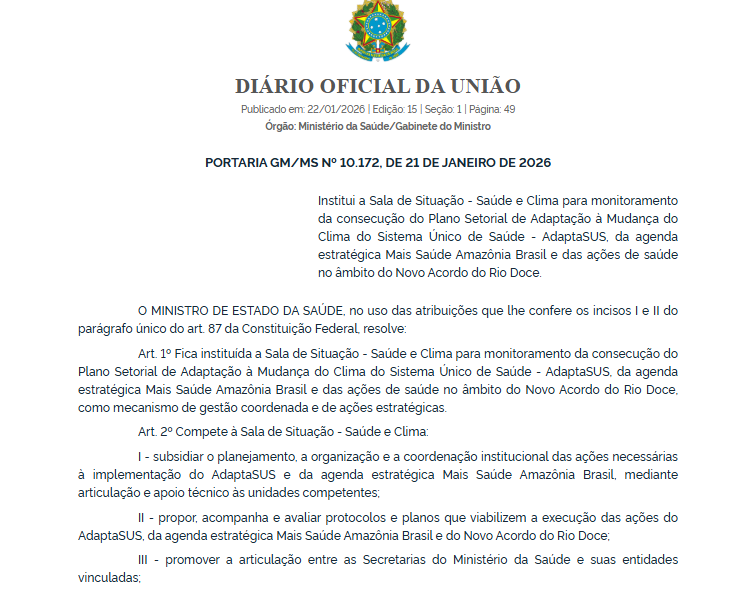 O Ministério da Saúde instituiu a Sala de Situação – Saúde e Clima, um novo mecanismo de gestão e monitoramento voltado ao acompanhamento das políticas de adaptação do Sistema Único de Saúde às mudanças climáticas. A medida foi oficializada por meio da Portaria GM/MS nº 10.172, publicada no Diário Oficial da União (DOU) desta quinta-feira (22/1).
