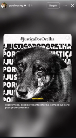 A publicação foi feita nos stories do Instagram do ator nesta quarta-feira (28/1) e reproduz um post divulgado pela Polícia Civil de Santa Catarina, em parceria com páginas oficiais do governo estadual, do Semae e da Delegacia de Proteção Animal. A imagem trazia uma montagem do animal acompanhada de um pedido por justiça.