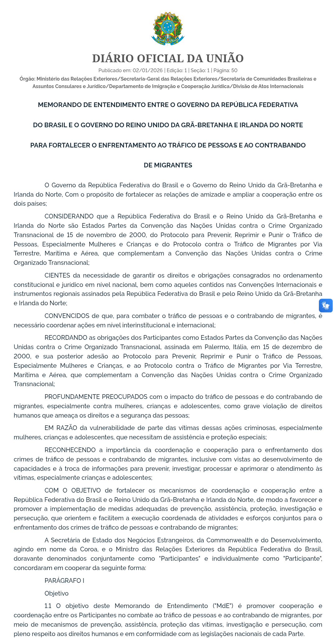 O Brasil e o Reino Unido formalizaram um memorando de entendimento para fortalecer o enfrentamento ao tráfico de pessoas e ao contrabando de migrantes. O acordo foi publicado no Diário Oficial da União desta sexta-feira (2/1), pelo Ministério das Relações Exteriores, e estabelece diretrizes de cooperação entre os dois países na prevenção, investigação e repressão desses crimes.