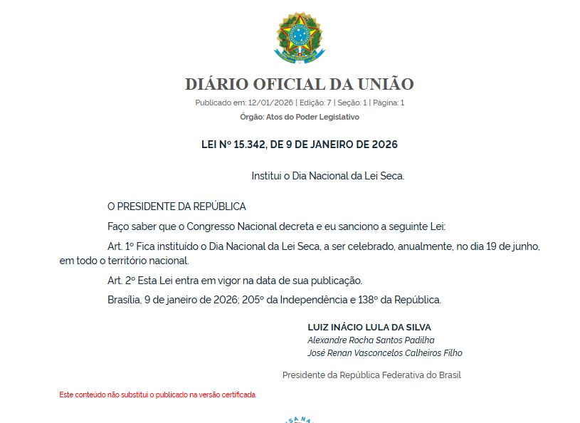 O Brasil passa a contar oficialmente com o Dia Nacional da Lei Seca, que será celebrado todos os anos em 19 de junho. A data foi instituída pela Lei 15.342, sancionada pelo presidente Luiz Inácio Lula da Silva e publicada no Diário Oficial da União (DOU) desta segunda-feira (12/1).