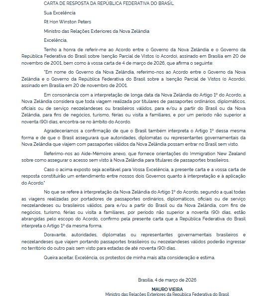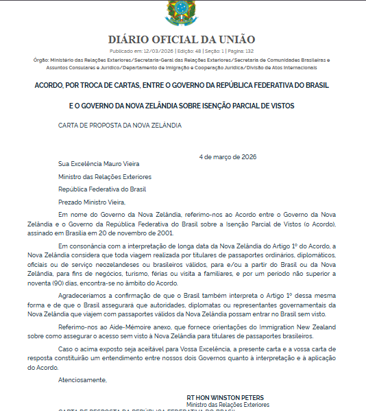 O documento registra uma troca de cartas entre os ministérios das Relações Exteriores do Brasil e da Nova Zelândia, que reafirma a interpretação do acordo assinado em Brasília em 2001. Segundo o entendimento oficial, cidadãos brasileiros e neozelandeses com passaportes válidos podem entrar no território do outro país sem visto para viagens de curta duração.