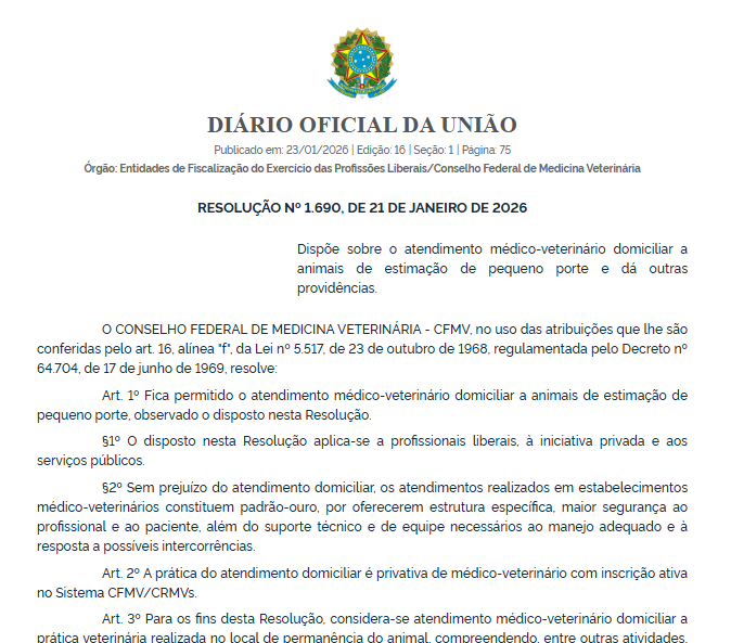 O Conselho Federal de Medicina Veterinária (CFMV) publicou no Diário Oficial da União (DOU) a Resolução nº 1.690, de 21 de janeiro de 2026, que regulamenta o atendimento médico-veterinário domiciliar a animais de estimação de pequeno porte em todo o país. A norma define regras, limites e responsabilidades para a prática, válida para profissionais liberais, iniciativa privada e serviços públicos.