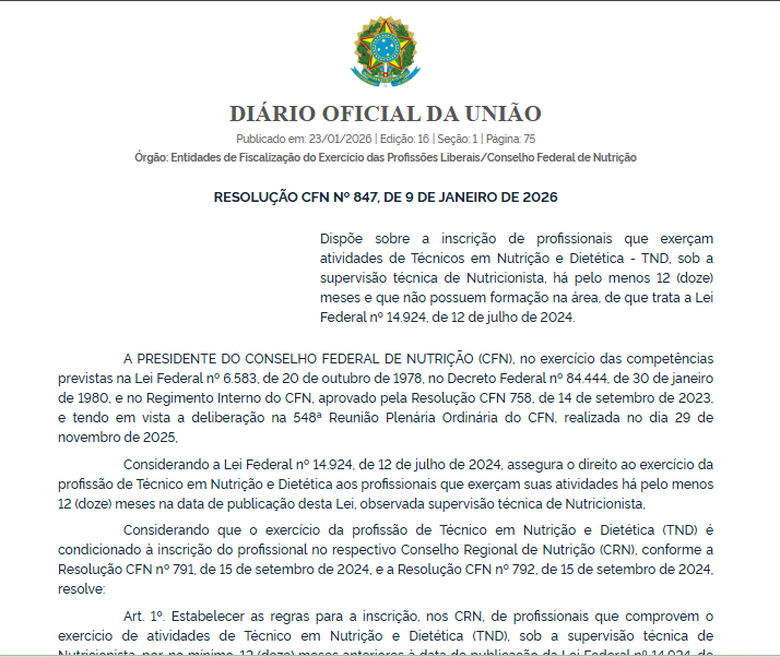 O Conselho Federal de Nutrição (CFN) publicou no Diário Oficial da União (DOU) a Resolução nº 847/2026, que estabelece as regras para a inscrição nos Conselhos Regionais de Nutrição de profissionais que atuam como Técnicos em Nutrição e Dietética (TND) sem formação específica, desde que comprovem exercício da atividade por, no mínimo, 12 meses sob supervisão técnica de nutricionista.