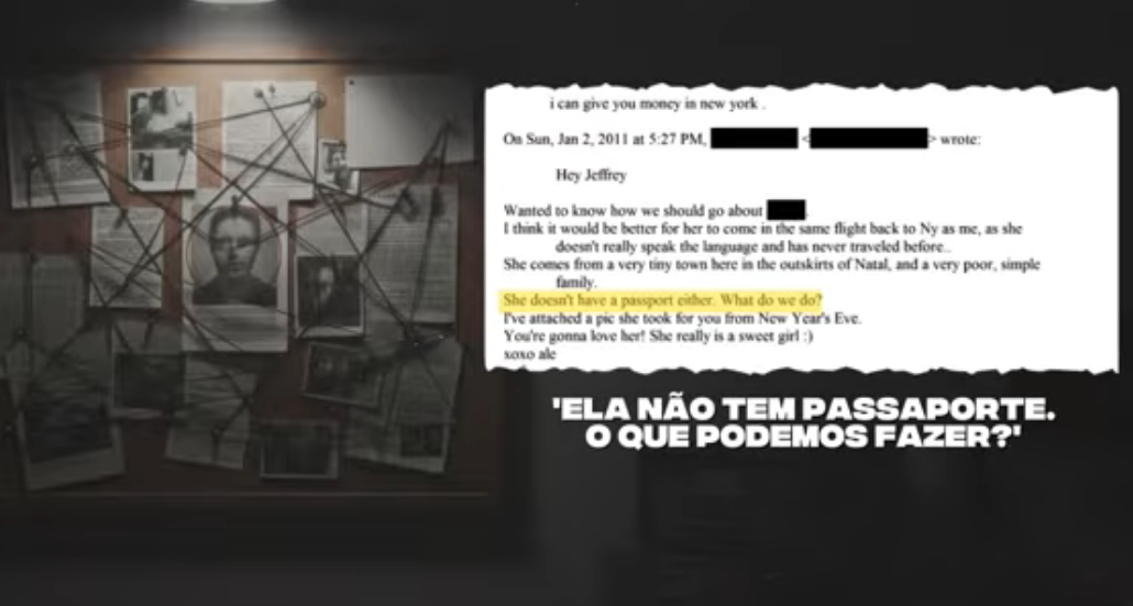Entre os registros, há referências a uma brasileira que mantinha contato com Epstein desde sua primeira prisão, nos Estados Unidos. Em mensagens encontradas nos arquivos, ela relata ter buscado jovens principalmente na região Nordeste. Em um dos e-mails, ela menciona ter conhecido uma garota em Natal e solicita que Epstein pague passagem e visto para levá-la aos Estados Unidos, pedido que teria sido aceito.