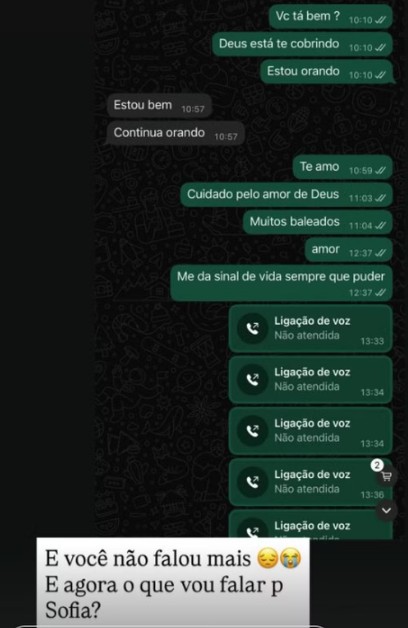 Mais tarde, entre 13h33 e 13h36, Jéssica tentou ligar várias vezes, mas não teve resposta. “E você não falou mais. E agora o que vou falar pra Sofia?”, desabafou em uma publicação.
