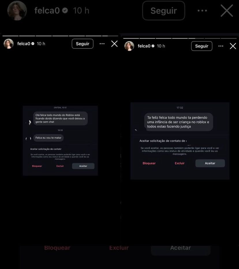 Em stories no Instagram, Felca relatou que crianças começaram a enviar mensagens agressivas, atribuindo a ele a decisão do Roblox de remover o chat de voz. “Eu estou sendo atacado por crianças na minha DM por conta que o Roblox tirou o chat de voz”, escreveu o influenciador ao compartilhar prints das mensagens recebidas. Entre elas, uma ameaça direta: “Felca, eu vou te matar”.