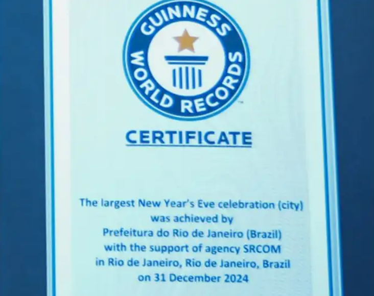 O título foi entregue oficialmente ao prefeito Eduardo Paes no palco principal das comemorações do Réveillon 2026, em Copacabana, pela jurada do Guinness Camila Borenstein. A certificação levou em conta critérios como número de participantes, dimensão da programação artística, abrangência territorial do evento e relevância cultural.