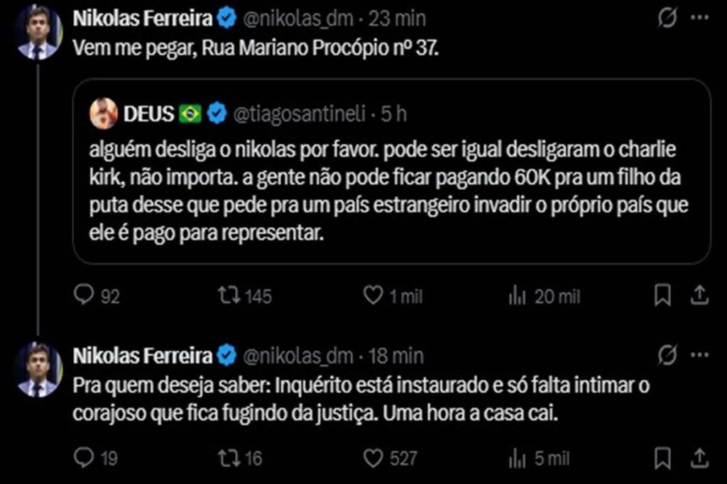 A Polícia Legislativa Federal (PLF) abriu uma investigação contra o humorista Tiago Santinelli, após ele fazer um post nas redes sociais pedindo a internautas para “desligarem” o deputado federal Nikolas Ferreira (PL-MG), “igual a Charlie Kirk”, fazendo referência ao ativista de extrema-direita e apoiador de Donald Trump que foi assassinado por um atirador nos Estados Unidos em 2025.