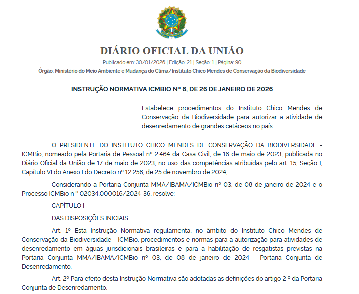 O Instituto Chico Mendes de Conservação da Biodiversidade publicou novas regras para a autorização de atividades de desenredamento de grandes cetáceos, como baleias, em águas jurisdicionais brasileiras. As diretrizes constam na Instrução Normativa ICMBio nº 8, de 26 de janeiro de 2026, divulgada no Diário Oficial da União (DOU) desta sexta-feira (30/1).