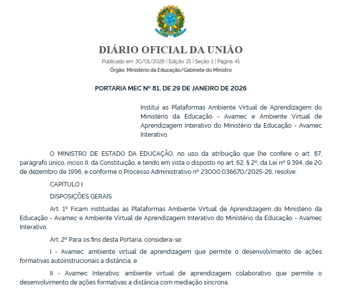 O Ministério da Educação instituiu oficialmente duas novas plataformas digitais voltadas à formação continuada de profissionais da área educacional. A medida consta na Portaria MEC nº 81, de 29 de janeiro de 2026, publicada no Diário Oficial da União (DOU) desta sexta-feira (30/1), e cria o Ambiente Virtual de Aprendizagem do MEC, o Avamec, e o Ambiente Virtual de Aprendizagem Interativo do MEC, o Avamec Interativo.