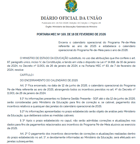 O Ministério da Educação publicou no Diário Oficial da União (DOU) a Portaria nº 169 de 18 de fevereiro de 2026, que estabelece oficialmente o calendário operacional do Programa Pé-de-Meia para o ano de 2026. O documento traz todas as datas de envio de dados pelas redes de ensino e os períodos previstos para pagamento dos incentivos.