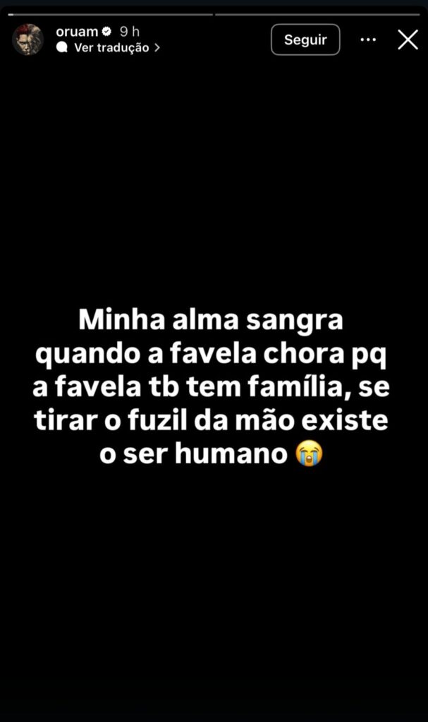“Minha alma sangra quando a favela chora, porque a favela tem família. Se tirar o fuzil da mão, existe o ser humano”, escreveu Oruam nos stories.