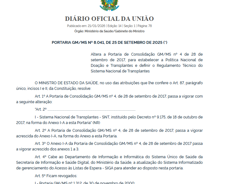 O Ministério da Saúde publicou no Diário Oficial da União (DOU) a Portaria GM/MS nº 8.041, de 25 de setembro de 2025, que institui oficialmente a Política Nacional de Doação e Transplantes e aprova um novo Regulamento Técnico do Sistema Nacional de Transplantes. A norma altera a Portaria de Consolidação nº 4, de 2017, e estabelece diretrizes atualizadas para a organização, funcionamento e fiscalização das atividades de doação e transplante de órgãos, tecidos e células no âmbito do Sistema Único de Saúde (SUS).