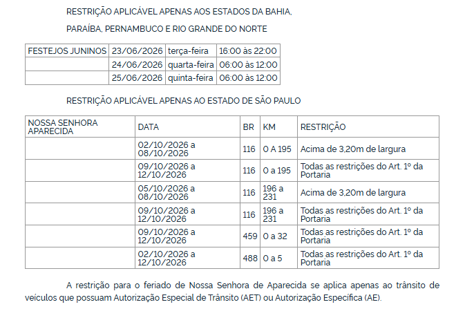 De acordo com a Portaria DIOP/PRF nº 12, ficam proibidos de circular, nos dias e horários definidos, veículos com largura superior a 2,60 metros, altura acima de 4,40 metros, comprimento total maior que 19,80 metros ou Peso Bruto Total Combinado superior a 58,5 toneladas. A restrição atinge Combinações de Veículos de Carga, de Transporte de Veículos e de Transporte de Veículos e Cargas Paletizadas.