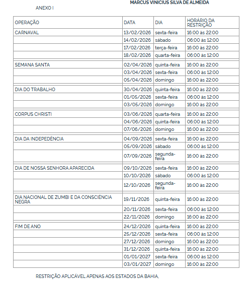 O calendário de restrições abrange os feriados de Carnaval, Semana Santa, Dia do Trabalho, Corpus Christi, Independência, Nossa Senhora Aparecida, Dia da Consciência Negra e o período de Fim de Ano, com horários que variam entre manhã e tarde. Há ainda restrições específicas para os festejos juninos nos estados da Bahia, Paraíba, Pernambuco e Rio Grande do Norte.