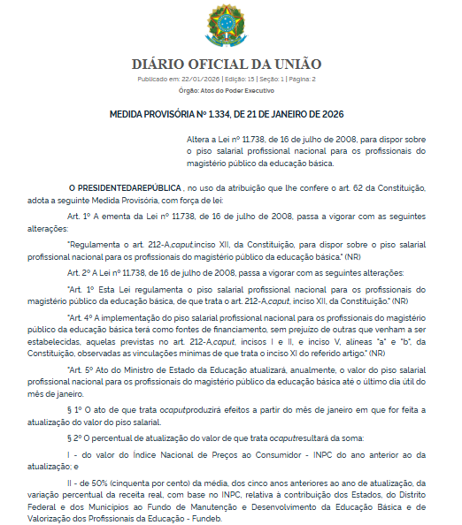 O governo federal publicou no Diário Oficial da União (DOU) desta quinta-feira (22/1) a Medida Provisória nº 1.334/2026, que altera a Lei nº 11.738/2008 e estabelece novas regras para o piso salarial profissional nacional dos profissionais do magistério público da educação básica. A norma entra em vigor na data da publicação e passa a ter força de lei imediata.