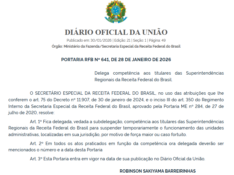 De acordo com a Portaria RFB nº 641, de 28 de janeiro de 2026, os titulares das Superintendências Regionais passam a ter competência para interromper as atividades de delegacias, agências ou postos de atendimento sob sua jurisdição em casos de força maior ou ocorrência de fatos imprevisíveis.