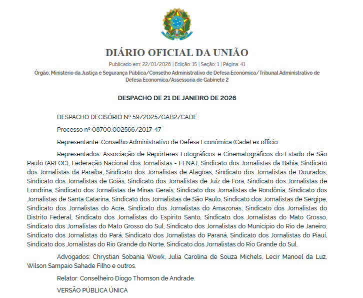O Conselho Administrativo de Defesa Econômica (Cade) abriu prazo para que sindicatos de jornalistas e entidades representativas da categoria em todo o país se manifestem em um processo administrativo que apura suposta prática anticoncorrencial relacionada à promoção de conduta comercial uniforme. O despacho foi publicado no Diário Oficial da União (DOU) desta quinta-feira (22/1).